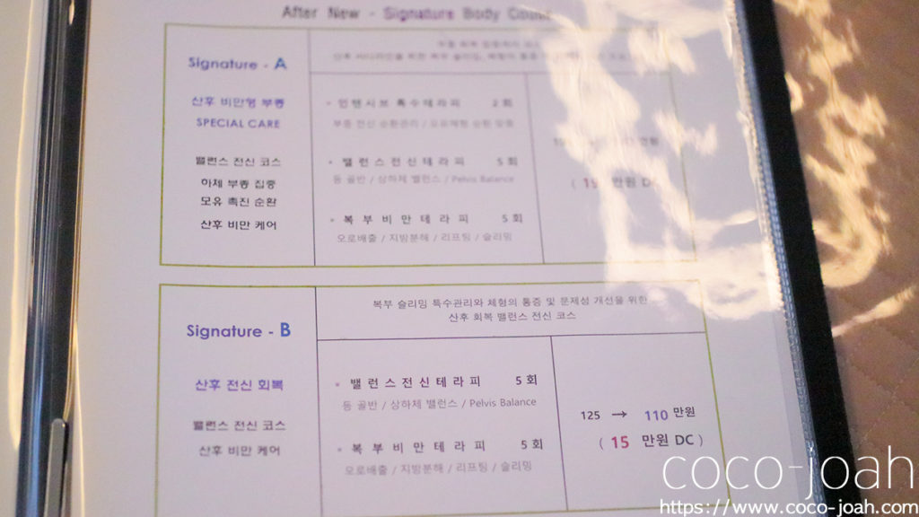 追加でもっと受けたいときはこの2つのコースがあり、妊娠中太ってしまった身体を元に戻りやすくケアするものや骨盤ケアするものがありました。